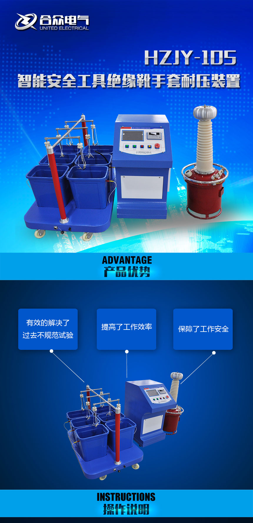 HZJY-105智能安全工具絕緣靴手套耐壓裝置,采用先進的微電子處理技術,全部使用過程可提前進行設置,全中文界面,操作簡單明了。全部測試項目設定后自動進行測試,無須人工干預。