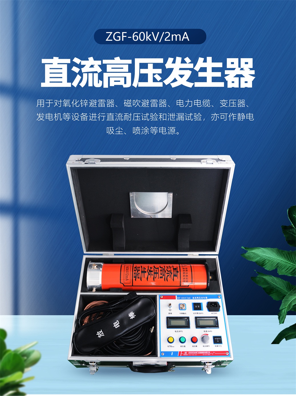 本儀器適用于電力、鐵路、化工、工礦、冶金、鋼鐵等部門對氧化鋅避雷器、磁吹避雷器、電力電纜、變壓器、發(fā)電機(jī)等設(shè)備進(jìn)行直流耐壓試驗(yàn)和泄漏試驗(yàn),亦可作靜電吸塵、噴涂等電源。