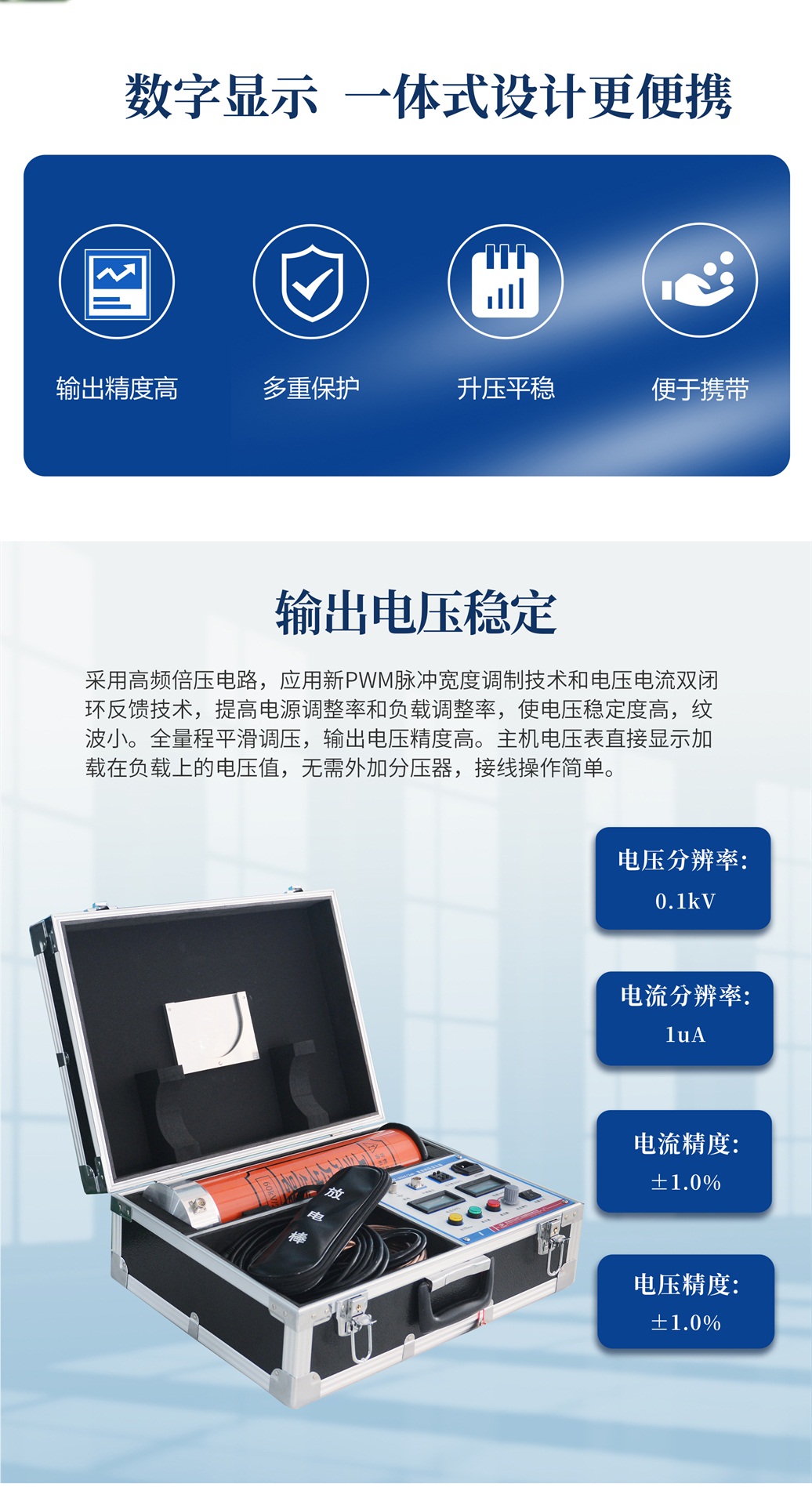 本儀器采用高頻倍壓電路,應(yīng)用新PWM脈沖寬度調(diào)制技術(shù)和電壓電流雙閉環(huán)反饋技術(shù),提高電源調(diào)整率和負(fù)載調(diào)整率,使電壓穩(wěn)定度高,紋波小。使用進(jìn)口大功率IGBT器件及其驅(qū)動技術(shù),消除開關(guān)干擾,實(shí)現(xiàn)直流高壓發(fā)生器的高品質(zhì)和便攜性。選用進(jìn)口高頻高壓整流二極管,使倍壓筒更加小巧輕便,提升整機(jī)效率。根據(jù)EMI電磁干擾和EMC電磁兼容理論,采用屏蔽、隔離和接地等措施,提升整機(jī)安全性,并能承受額定電壓放電而不損壞。儀器保護(hù)功能齊全,具有零位保護(hù)、過壓保護(hù)、過流保護(hù)、擊穿保護(hù),保護(hù)電路選用納秒級專用傳感器,動作迅速可靠,有效保障人身及設(shè)備安全。過壓整定選用數(shù)字撥碼開關(guān),操作簡單并具有較高的整定精度。增設(shè)智能高精度0.75U功能按鈕,利于氧化鋅避雷器的測試。