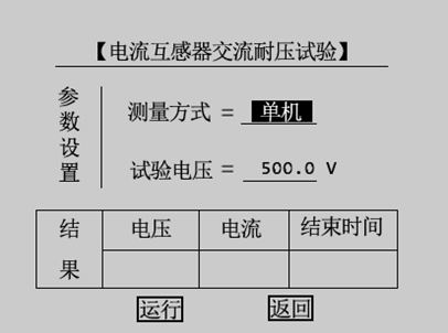 試驗電壓:指本次試驗交流輸出保持電壓。“單機(jī)”時,儀器默認(rèn)電壓值為500V,內(nèi)置升壓器電壓范圍為(0~1000)V,在AC220V電源輸入情況下最高輸出電壓為600V,在AC380V電源輸入情況下最高輸出電壓1000V。互感器綜合特性測試儀選用“升壓器”時,儀器默認(rèn)電壓值為1500V,外接升壓器電壓范圍為(0~2500)V。