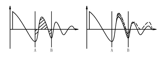 在任意指定的區間內,對標準線圈和被測線圈波形偏差部分的面積(如圖1-4-2中陰影部分)與標準線圈波形面積進行相除比較。計算出A-B區間內差的面積,對比A-B區間內標準波形面積,來判定偏差的程度。判定的標準用百分比(%)進行設定,計算結果在范圍內的為合格品。波形偏差面積的大小表示電感值以及能量損耗程度的總和。此方法可較全面地檢查線圈的電感值及能量損失。