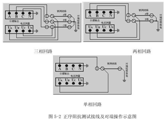 進行正序阻抗(正序短路)測試時,將對端短接接地,如圖5-2。實際測量中,由于儀器測試電源三相平衡度較高,對端完全可以接地,不會引入超過精度要求的測量誤差。這樣,可以與零序阻抗測試時的對端狀況保持一致,簡化對端操作,提高工作效率。